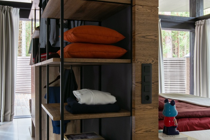 Участок был превосходны: рядом с рекой, в лесу. Чтобы сохранить связь природы и интерьера, архитектор спроектировал небольшой павильон с ленточным остеклением и дощатой террасой по периметру и бережно интегрировал его в природный ландшафт. Центральный объем, в котором расположена гостиная, застеклен с обоих фасадов и открывает вид на лес, а сквозь террасу буквально прорастают ели…