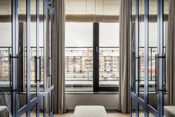Большая квартира находится в доме премиум-класса на Шаболовской, из ее окон открывается вид на конструктивистскую застройку района и Шуховскую башню.