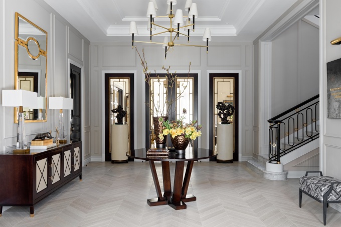 Дизайнеры Наталья Мартынова и Елена Бородина спроектировали квартиру площадью 260 кв. м, задуманную владельцем как инвестиционный проект. Квартира находится в центре Москвы, на Остоженке, фасад дома – это современная классика с элементами модерна. Чтобы внешний и внутренний облик гармонировали друг с другом, дизайнеры предложили концепцию американской классики с элементами ар-деко.