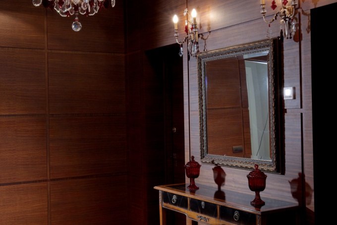 Квартира исполнена в уютном минимализме с элементами классического стиля. Идеей для создания интерьера послужило антикварное венецианское зеркало в ванной комнате. Его орнамент повторяется в плитке, фурнитуре мебели и форме хрустальных светильников Banci.