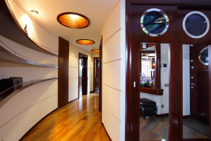 Для увлеченных яхтенным спортом заказчиков архитекторы спроектировали квартиру в стиле роскошной яхты. В ее оформлении они использовали весь арсенал средств, подчеркивающих стилистику квартиры: роскошное полированное красное дерево, окна-иллюминаторы, хромированные детали и декоративные элементы с морской символикой.