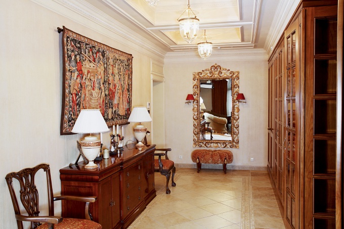 Немаловажную роль играет освещение прихожей. Старинный английский стиль входной зоны подчеркнут всевозможные абажуры, используемые в виде массивных люстр. Однако верхние светильники используются исключительно в декоративных целях. Основное освещение обеспечивают парные настольные лампы или бра. О чем свидетельствуют фото дизайна входных зон, представленные в этой рубрике.