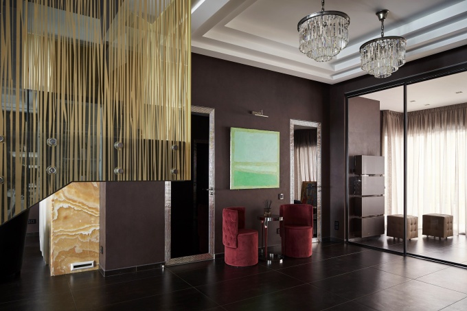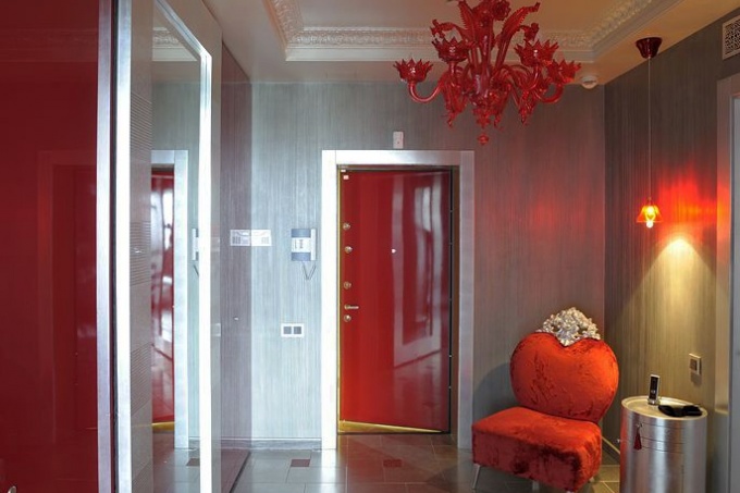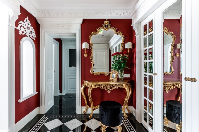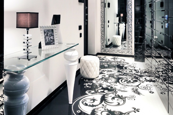 Основой дизайнерского решения может служить классический стиль с оттенками некоторого эксцентризма. Для отделки стен можно использовать оригинальные обои с узорами. Особым шиком выделяются модели из кожи, винила с голографическим эффектом, текстильные. Пол выкладывается штучным паркетом или глянцевой плиткой. Неповторимой «изюминкой» может стать жидкий пол с 3D эффектом, воссоздающим уникальные узоры, изображения. При оформлении потолка великолепным решением служит многоуровневая гипсокартонная конструкция. Неотъемлемыми элементами, дополняющими гламурный дизайн входной зоны, являются массивные красивые люстры и многочисленные зеркала.