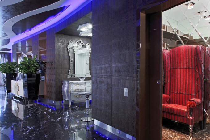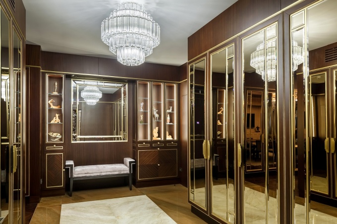 Архитекторы бюро «Дом-А» предложили сделать ставку на сложную светодиодную подсветку, эту идею заказчики восприняли с воодушевлением. Общая стилистика интерьера в процессе работы претерпела изменения: от жесткого минимализма до неоклассики с экстравагантной мебелью и светильниками фабрики Visionnaire.