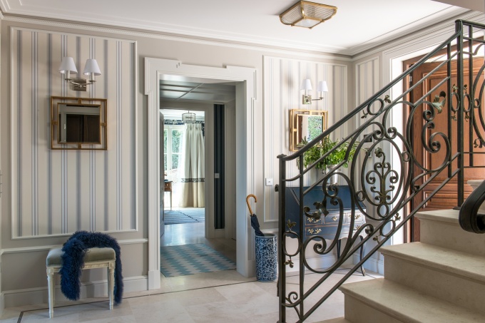 Заказчики обратились к декоратору Анне Павловой с пожеланием создать классический интерьер с историей. Но не пышный и парадный, а легкий, воздушный, камерный – в духе русской усадебной культуры и стилистики юга Франции. Декоратор предложила сместить акценты на серебристо-голубую цветовую гамму, состаренный паркет, белые столярные изделия, мебель в стиле французской классики и предметы искусства.