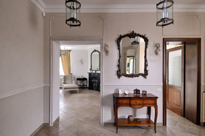 Особенности такого пространства, как прихожая прованс для оформления которой используется, диктуют определенные решения, применяемые в их обустройстве. Прежде всего, стоит отметить характерную именно для декорирования входной зоны деталь – наличие минимального количества предметов мебели. Существует перечень обязательных элементов, которыми должны быть обустроены прихожие в стиле прованс. Первое – это большое зеркало во весь рост, наличие которого продиктовано, прежде всего, функциональностью помещения. В некоторых вариантах интерьеров оно представлено в укороченном виде, что может быть продиктовано индивидуальными характеристиками обстановки. Дизайнеры предлагают устанавливать здесь тумбы, где будут храниться ключи и прочие вещи. На многих фото прихожих в стиле прованс можно увидеть небольшие кованые стеллажи, служащие в качестве подставок для цветов. Многие специалисты предпочитают обставлять входные зоны прованс для которых является основным стилевым решением, кушетками.