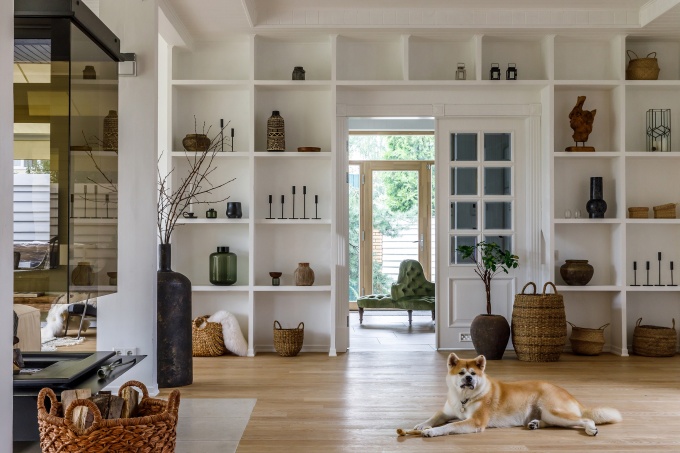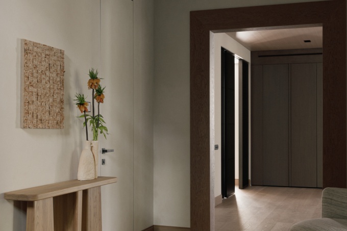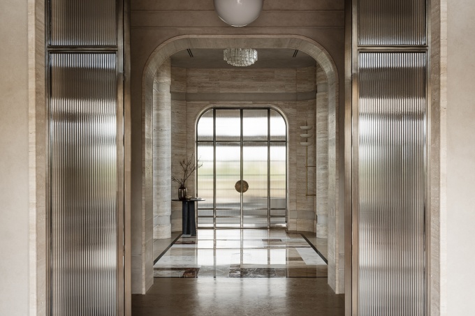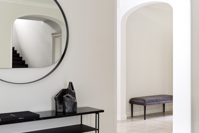 «Я не присутствовала на первой встрече, мне передали только запись разговора, - рассказывает архитектор. – В ней заказчица озвучила основные пожелания: связь интерьера с экстерьером, индивидуальная вневременная стилистка с отсылками к ар-деко, авторские, но без экстравагантности решения, нейтральная цветовая палитра с нюансной деталировкой и каменный пол в помещениях первого этажа. Сначала меня смущал камень, так как почти любой мрамор имеет активный рисунок и берет на себя много внимания. Но мне удалось найти идеальный вариант – юрский мрамор, у него абсолютно нейтральный цвет и сложная текстура с включением окаменелостей». В итоге именно камень задал основную линию: мягкие бежево-песочные оттенки и тактильные фактуры объединили весь интерьер. Благодаря такому решению все 1300 кв. м воспринимаются как единое цельное пространство, очень комфортное для проживания. Нейтральный цвет хорошо подчеркивает архитектуру и пластику стен и оттеняет цветовые акценты, раритетный винтаж и искусство.