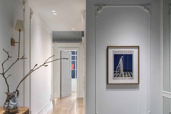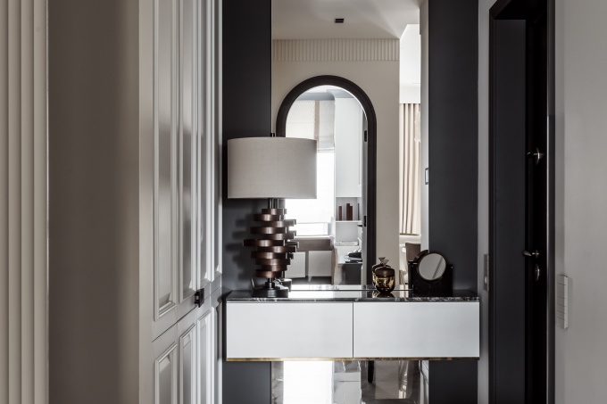 Особенность фасадов здания – исторические архитектурные приемы: арочные окна, крупный руст и «алмазная огранка» декоративных деталей. Именно они вдохновили автора на создание интерьера с необычной пластикой, деликатными рельефными орнаментами и элементами неоклассики.