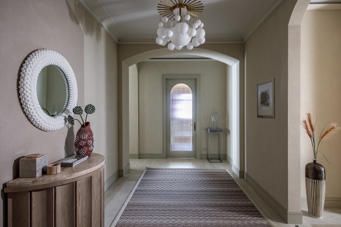 «Это наш второй проект для заказчиков. Ранее мы работали над проектом небольшого частного дома. Им понравилось направление неоклассики, и мы постарались воплотить сходную стилистику с учетом архитектуры комплекса. Основная идея интерьера – продолжение яркого визуального ряда, заданного рисунком фасада», - рассказывает дизайнер.