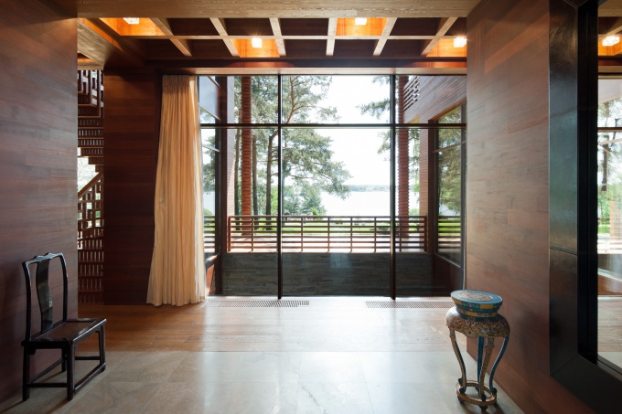 Дом развернут к водохранилищу южным фасадом, благодаря чему открывается прекрасная панорама на живописный пейзаж. Ощущение ориентированности на природу усиливает панорамное остекление первых этажей. Снаружи дом отделан шпунтованной доской из красного дерева разной ширины и плотности. Южный фасад обрамлен рядом рустованных колонн из дерева, они поддерживают навес второго этажа. С торцов деревянные рейки выглядят как ширмы, которые хорошо пропускают естественный и искусственный свет.