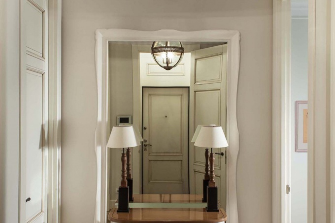 Во-первых, входная зона просто обязана быть просторной! В загородном доме мебели должно быть по минимуму. И обязательно должны присутствовать зеркала в полный рост: их наличие необходимо чисто психологически.