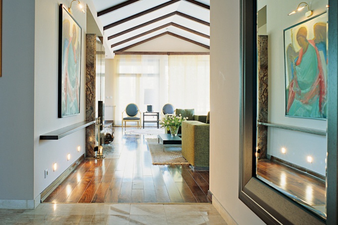В оформлении этой зоны - собирательного образа дома, правильно использовать акцентные, самые эффектные приемы декорирования. Например, мозаичные панно, лепнину, авторскую мебель... Важно определить и центральный элемент, который акцентирует и удерживает внимание.