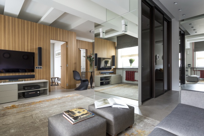 Квартира площадью 150 кв. метров имела всего три окна, поэтому перед авторами проекта стояла задача так распланировать помещения, чтобы еще больше не затемнить пространство. При выборе декора ставка была сделана на контрастную цветовую гамму и материалы, которые оптически увеличивают пространство: штукатурки с перламутром, зеркала, дерево с глянцем, стекло, металл.
