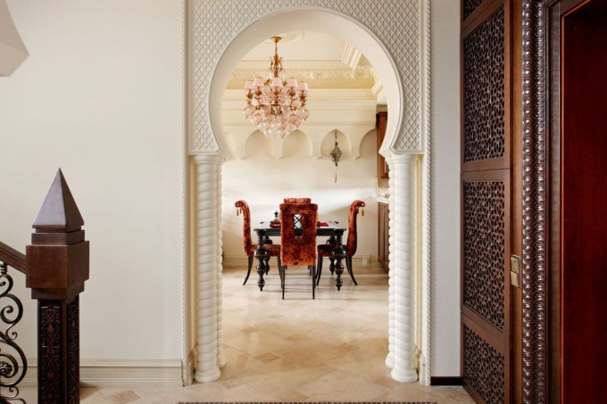 Этот загородный дом можно смело назвать взглядом западника на Восток. За основу проекта автор проекта взяла арабский стиль, но не только адаптировала его к нашему времени, но деликатно смиксовала с классикой, готикой и викторианским стилем. В итоге получился актуальный фьюжн с восточной доминантой.