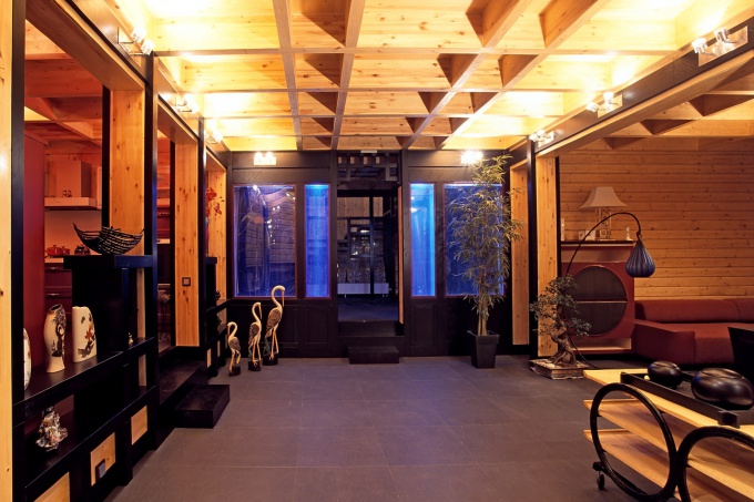В облике постройки читаются все основные черты японского жилища: сложной конструкции кровля с поднятыми к небу углами, резные кронштейны, поддерживающие большой вынос кровли, опоясывающие дом галереи и веранды, характерный орнамент декоративных элементов фасада, а также традиционные красные и зеленые цвета в отделке.
