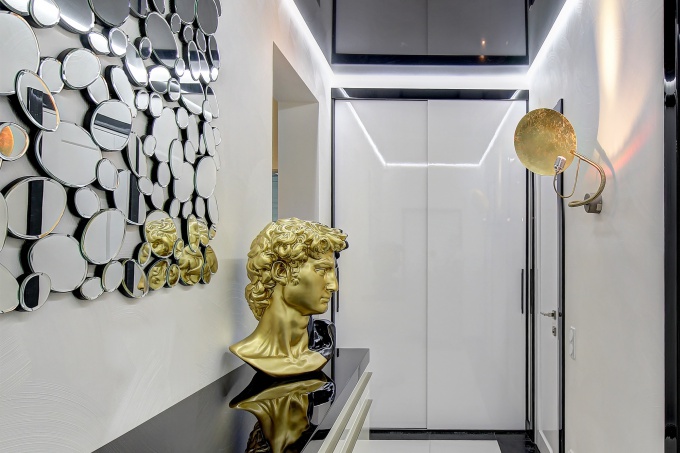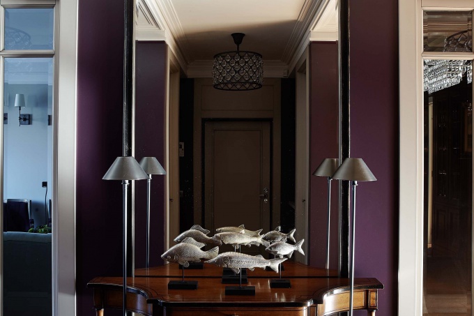 Основными декоративными акцентами стала авторская мебель и двери из ценных пород дерева и латуни.