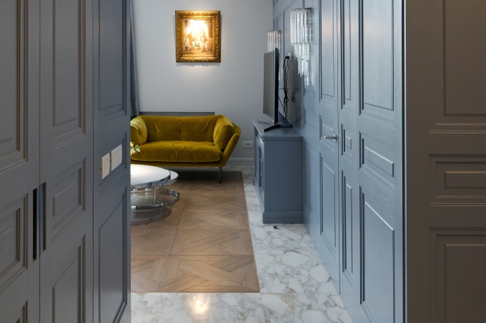 Для семейной пары, приближающейся к юбилею жемчужной свадьбы, дизайнер Светлана Юркова создала квартиру с атмосферой романтики, тепла и покоя, который напоминает о прогретой солнцем вилле на юге Франции. Сама дизайнер назвала его «нежное шале», изящно обыграв в пространстве брутальную стилистику исторической альпийской архитектуры, изысканность классических французских интерьеров и изящную простоту интерьеров Прованс.