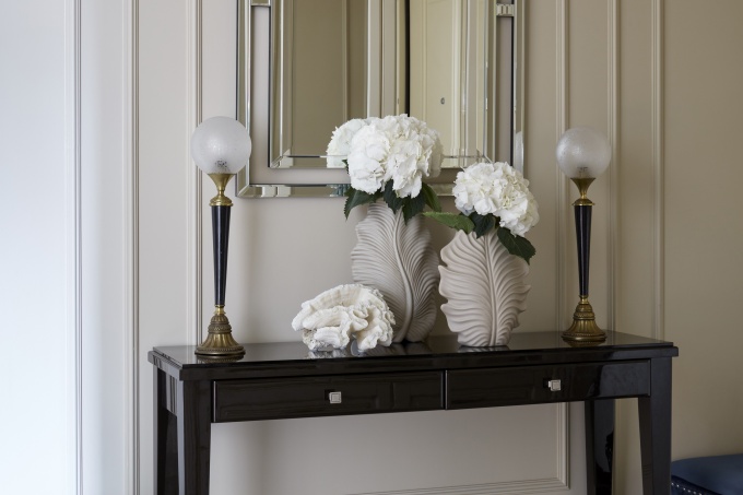 «В свое время в этой квартире жил президент Узбекистана, потом другие именитые советские деятели, а не так давно – один из известных российских деятелей эстрады и шоу-бизнеса», - рассказывает автор проекта. При создании нового образа квартиры Ирина стремилась подчеркнуть связь современности с историческим прошлым страны и спроектировала парадный интерьер: строгий, сдержанный, с элементами номенклатурного прошлого.