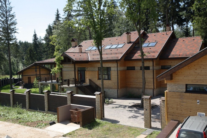 Этому служит высокий каменный фундамент, широкие террасы, которые зрительно увеличивают объем построек и разноуровневая скатная кровля. Она покрыта цементно-песчаной черепицей двух оттенков, что придает архитектуре этническое звучание. Кроме того, в отделке фасадов обоих домов использовалась тонированная доска и искусственный камень, имитирующий песчаник с грубо обработанной поверхностью.