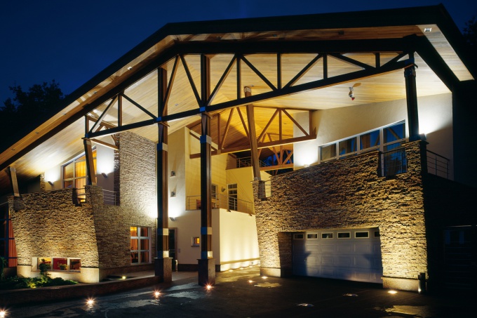 Главный корпус и флигель-гараж стоят независимо друг от друга, имея визуально объединяющий элемент кровли с двухконсольной фермой. Чтобы зафиксировать конструкцию фермы в пролете и попасть в заданную координату проема, пришлось наклонить ствольные опоры и несущую стену. Благодаря этому приему между двумя корпусами образуется свободный проход с интересной глубинной перспективой. Смещение конька относительно центра дает криволинейные срезы кровли на боковых фасадах.