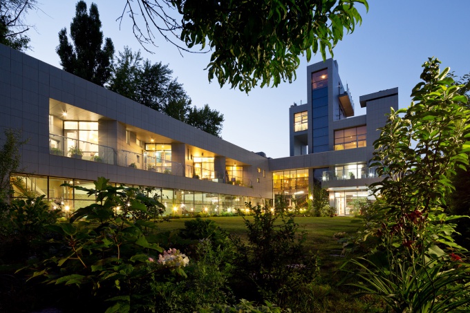 Большая площадь участка (15 га), позволила распластать почти 2000 кв. м сложной планировки этого дома на одном уровне, исключением стала лишь приватная зона, занявшая второй этаж. Здание представляет собой стилистически сложную объемно-пространственную композицию, в которой соединились черты классической модернисткой архитектуры, современного футуризма и советской архитектурной школы. Структурно оно словно набрано из простых геометрических форм (цилиндр, параллелепипед, куб), акцентированных скатной кровлей с приподнятыми вверх краями и динамичной фасадной подсветкой. Она разрезает объемы, задает ритм и проецирует на фасады символику, которая лежит в основе проекта. Отличительная черта проекта – это скульптурная композиция «Метеорит» Миxaила Ревы, композиционно и идейно связанная с архитектурой. Его центральный элемент - «Зерно жизни» - помещен во внутренний двор дома, на дно бассейна, струящегося между двумя объемами постройки. Самый внушительный каменный обломок стал частью декоративного пруда, более мелкие осколки метеорита рассыпаны по всему участку.