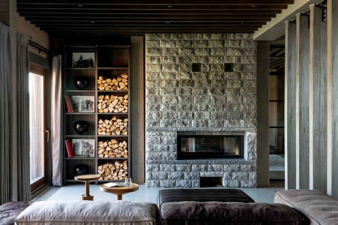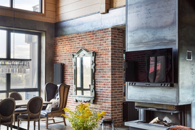 Этот необычный дом, в котором соединились элементы традиционного шале, индустриального лофта и мотивы русских сказок, дизайнер Ирина Шевченко оформила для очень близких ей людей. Семейная пара с двумя детьми любит и умеет отдыхать: принимать гостей, устраивать мероприятия, веселиться в русских традициях. Чтобы быть ближе к природе, они решили построить дом на Новой Риге у реки из бетона и дерева в духе брутальных нордических альпийских построек, но с русским характером.