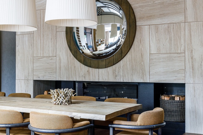 К дому пристроена просторная терраса с большим камином и обеденным столом на десять персон. На участке также спроектирован двухэтажный СПА-комплекс с бассейном и всесезонная теплица, где семья выращивает овощи и зелень, воплощая концепцию farm to table. Это настоящая современная усадьба, где интерьер, архитектура и ландшафт тесно связаны друг с другом.