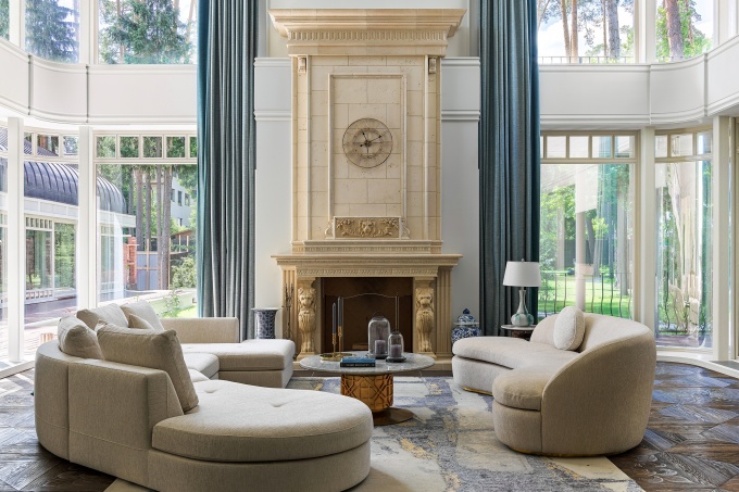 Центральное место зала занимает, конечно, камин. Его располагают таким образом, чтобы в дневное время портал хорошо просматривался с порога каждого входа, был всегда в фокусе солнечных лучей, а в ночное – мерцающий огонь освещал зону отдыха. Для холодных районов дымоход монтируют в одну из центральных несущих стен, что позволит повысить температуру жилища зимой. Практичный дизайн интерьера каминной в неоклассическом стиле подойдет также жителям юга страны.