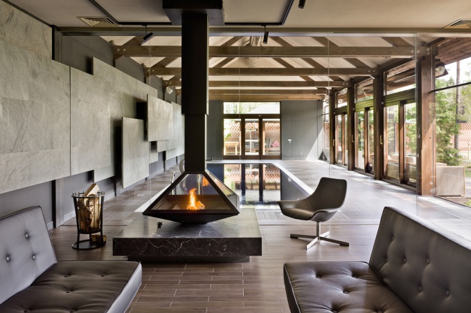 Двухэтажный гостевой дом со SPA-комплексом находится на участке поблизости от главного дома. Его современная архитектура с панорамным остеклением рифмуется с обликом основного жилого строения с фасадами-витринами и деревянной отделкой. Чтобы подчеркнуть связь дома и природного окружения, в отделке помещений были использованы исключительно природные материалы: сланец и дерево.