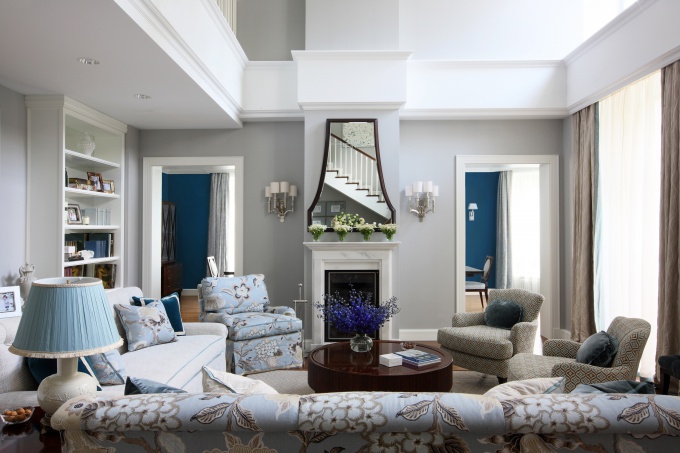 Интерьер небольшого двухэтажного дома получился свежим, уютным и очень женственным. Глядя на него, вспоминается весенний сад с первыми распускающимися цветами на фоне чистого голубого неба. Так происходит, во-первых, из-за использования в декоре разных оттенков синего цвета, а во-вторых – благодаря цветочной орнаментике, столь популярной в английских и французских неоклассических интерьерах.