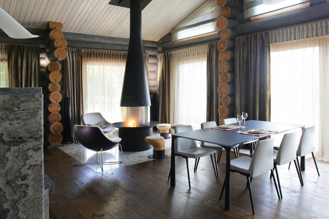 Архитекторы Ирина Мавродиева и Артур Гога создали экстравагантный загородный интерьер в серебристо-лиловых тонах. Современная архитектура дома располагала к созданию функционального пространства с открытыми просторными помещениями, стилистику в облегченного духе ар-деко с элементами гламура определила настенная роспись с изображением игуаны.