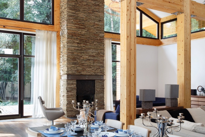 Над проектом дома работала архитектор Елена Волгина (АБ "Шаболовка"). Использование текстуры природного сланца и древесины бирманского тика во внутренней отделке позволили ей поддержать образ дома с эко-темой.