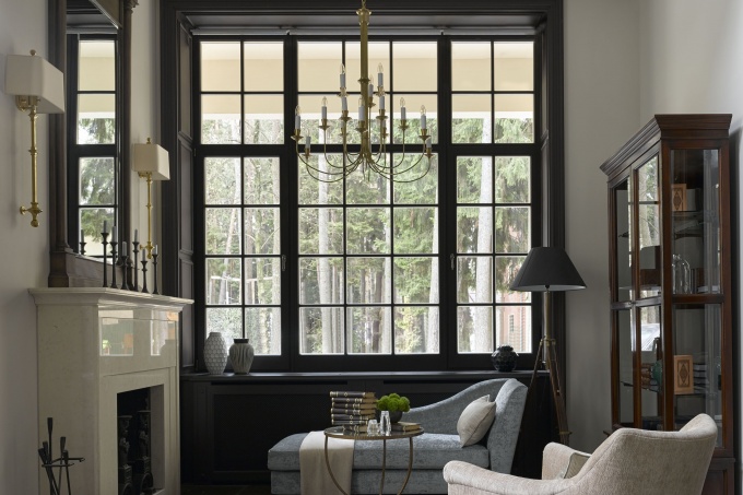 Большой объем дома с панорамным остеклением, 4-х метровыми потолками и открытыми пространствами задал внутренний масштаб, сориентировал архитекторов на крупные формы и сдержанный, но убедительный, декор.