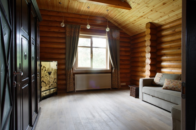 Дизайн дома из оцилиндрованного соснового бревна выполнен в современном стиле с яркими цветовыми акцентами.