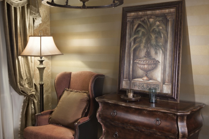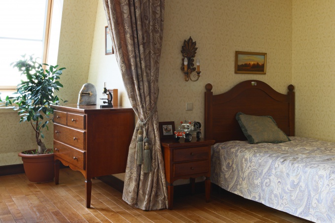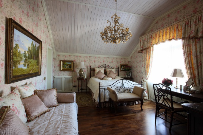 Неотъемлемой составляющей дизайна такого интерьера является текстиль. Он представлен в виде штор и гардин, а также ламбрекенов и балдахинов. Важно также, чтобы подобные драпировки подходили по своему цветовому решению и фактуре элементам постельного белья, которые украшают кровать.