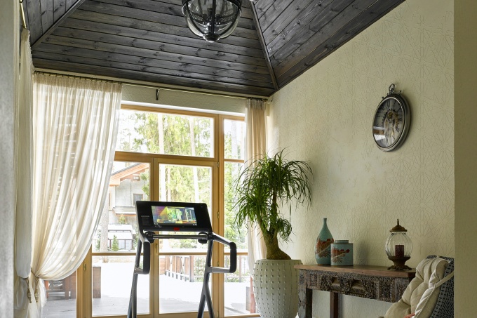 Занимаясь обустройством домашнего спортзала, пристальное внимание следует уделить выбору материалов отделки. Для оформления стен важно использовать покрытия, обладающие паропроницаемыми свойствами: цветную штукатурку, бумажные обои. Хорошим решением являются натуральные пробковые панели.