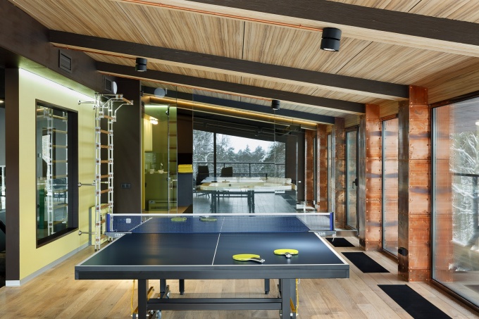 В просторном помещении возможно оснащение дополнительной игровой зоны: теннисного, баскетбольного зала, бильярдной. Разграничить комнату поможет стильная барная стойка.
