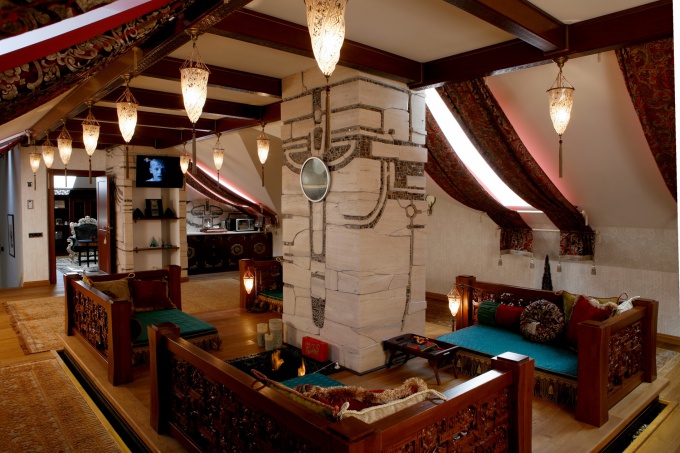 Пол может быть выложен из мрамора или паркета. Уместным дополнением станет ковер с невысоким ворсом. Обязательными элементами интерьера кальянной комнаты являются легкие занавески, шторы, балдахины. Использование текстиля позволяет привнести в атмосферу мягкость, ощущение расслабляющего умиротворения.