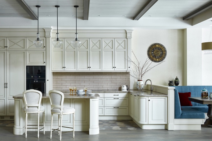 Поэтому перед дизайнерами они поставили задачу не только разработать и реализовать дизайн-проект интерьеров, но и оптимизировать пространство, а также оформить изначально невыразительные фасады, придав им сходство с альпийским шале, и построить на территории теплую беседку с кухней, где можно с комфортом отдыхать в любой сезон. «На все проектные, строительные и отделочные работы у нас был всего один год! Поэтому мы собрали крепкую команду из специалистов разных областей с гибким профессиональным мышлением, - рассказывает автор проекта Варвара Калицкая. – Многие процессы шли не по классическому сценарию: проектирование велось одновременно с отделкой, многие идеи реализовывались «с листа», а комплектация осуществлялась из наличия». Поскольку в доме частично были проведены инженерные системы (электрика, системы вентиляции, слаботочная система), то удалось немного времени выиграть на монтаже коммуникаций. «Хотя 50 процентов инженерии (включая оборудование бассейна) нам все же пришлось спроектировать самим», - отмечает автор проекта.