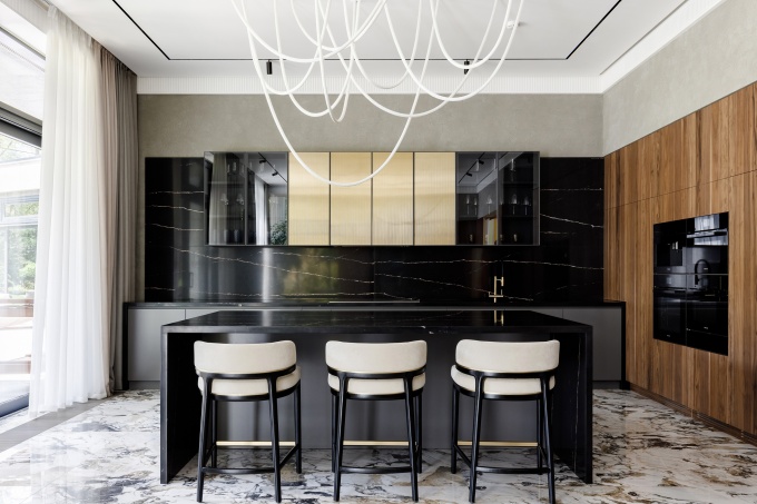 Руководители бюро Borosa Group – Оксана и Всеволод Волковы – признаются, что этот статный дом с оригинальной архитектурой и эффектными интерьерами был одним из самых быстро реализованных проектов бюро с такой площадью. От концепции архитектуры и дизайна интерьера до авторского надзора, строительства и внутренней отделки частного здания площадью 1200 кв. м прошло всего два года.