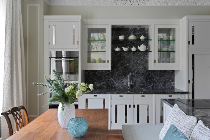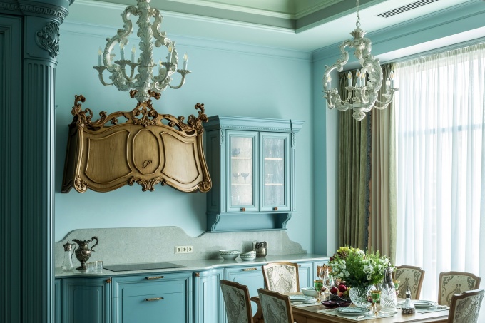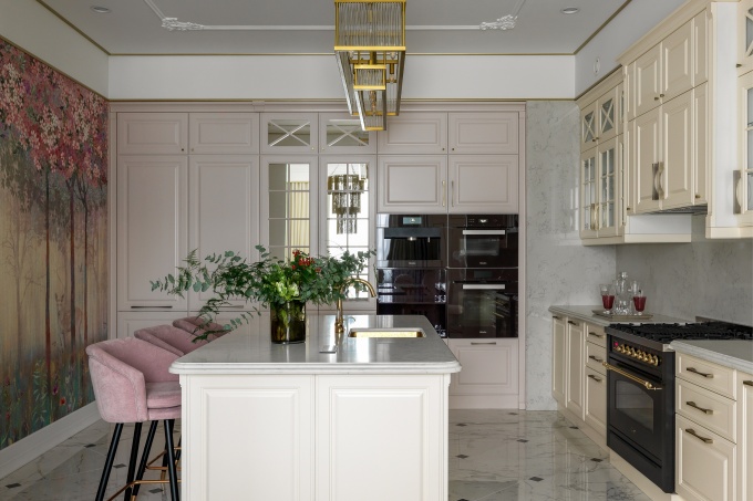 На стилистику интерьера во многом повлияло месторасположение, соседство с дворцовыми ансамблями семьи Романовых, а также любовь заказчицы к элегантному классическому стилю.