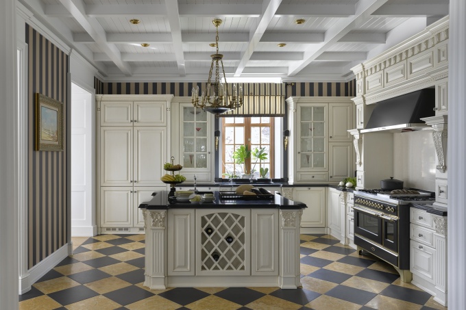 Полы должны быть паркетными, легких природных оттенков: желтого, белого, светло-зеленого, нежно-голубого. Также изысканный интерьер кухни в классическом стиле предполагает, что бытовая техника или удачно гармонирует с другими имеющимися предметами мебели, или выгодно подчеркивает оригинальность интерьера.