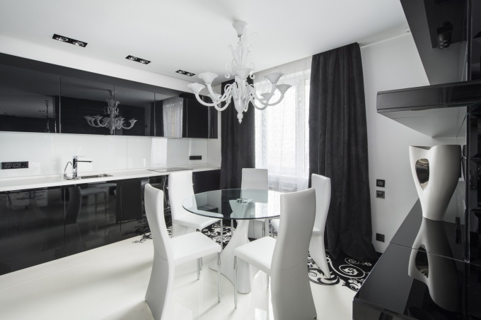 Отличительной особенностью стиля является большое количество зеркал, глянцевых поверхностей. Неповторимое впечатление производит дизайн гламурной кухни в черно-белой цветовой гамме с продуманным освещением. Подобное помещение прекрасно подойдет для общения, проведения дружеских вечеринок. В качестве отделки стен, рабочей зоны рекомендуется использование зеркальной плитки. Она обеспечит максимальную простоту в уходе за помещением, придав ему, одновременно, роскошный внешний вид.
