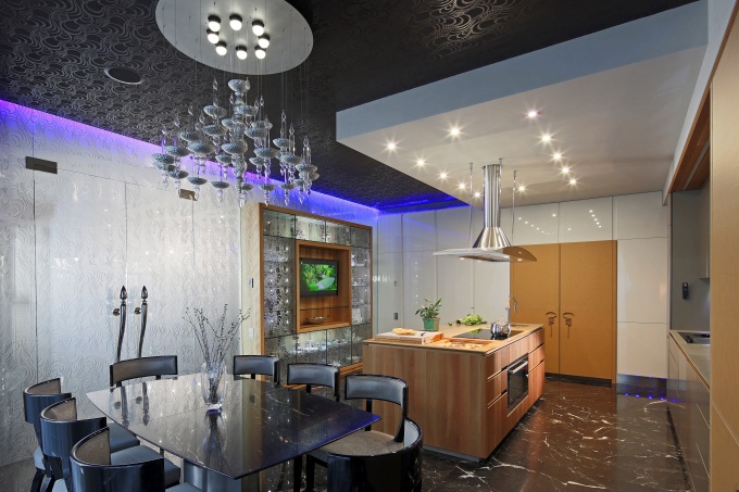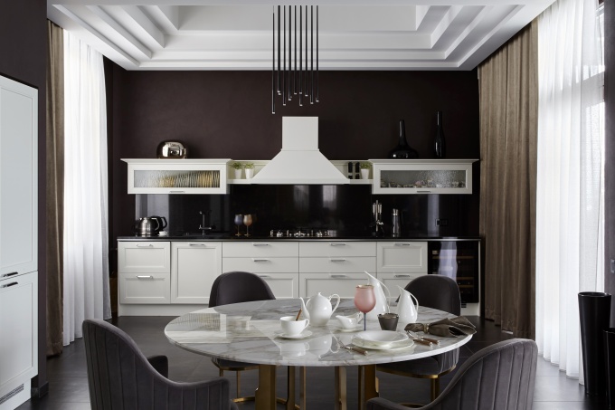 Особыми штрихами, подчеркивающими индивидуальность гламура, станут мягкое приглушенное освещение и мерцающие отблески на блестящих поверхностях. Подобного эффекта можно добиться, используя мозаичную плитку, темную кухонную мебель, встроенные светильники.