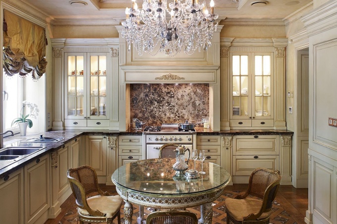 Кухня издавна считалась одним из самых главных помещений в доме. Это уголок, где приятно собраться всей семьей, побеседовать с друзьями и, одновременно, рабочее место хозяйки. Грамотно спланированный интерьер кухни в стиле гламур предполагает роскошь обстановки, наличие уютного места для общения и функциональной зоны для приготовления пищи.