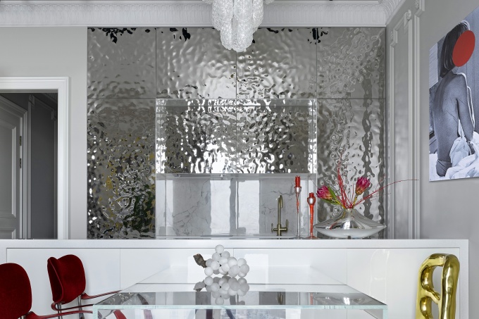 Дизайнер Ольга Солнышкова создала интерьер, который впечатляет смелостью декора, яркими красками и сочетанием казалось бы полярных вещей: серебристого металла и обивки «под зебру», классического лепного декора и гротескных золотых стульев, антикварной люстры из Парижа и искусства из актуальных московских галерей.