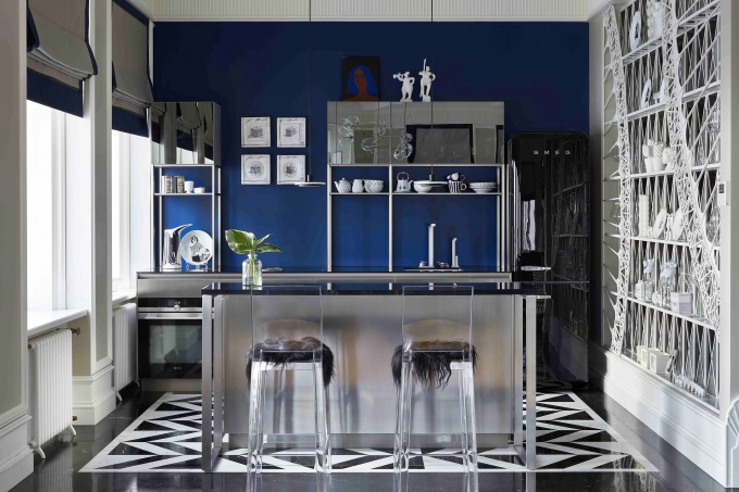 Единственным нюансом стала форма квартиры – с острым углом по главному фасаду, который ассоциировался с носом корабля. «Так родилась основная тема – морская, однако делать просто брутальный интерьер в морском стиле совсем не хотелось, поэтому мы деликатно обыграли ее на фоне парадного классического интерьера», - рассказывает автор проекта.