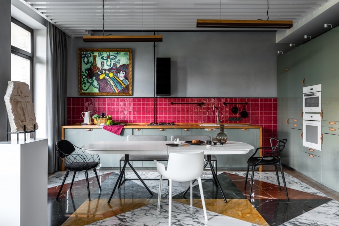 Создать интерьер без правил, с одной стороны, мечта любого дизайнера, с другой – задача очень непростая. «Важно было найти баланс, чтобы яркий и многосложный дизайн не спорил с сильным по цвету и эмоциям искусством. В итоге решили работать широкими заливками и на контрастах: светлых нейтральных плоскостей и мощных акцентов в виде пестрого натурального камня, винтажной амбарной доски, кирпича ручной работы, разноцветной мебели», - рассказывает автор проекта.
