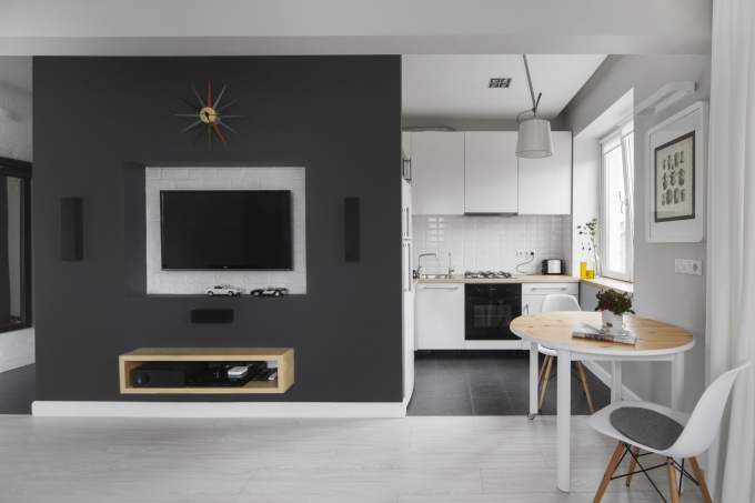 Для молодого холостяка дизайнер Максим Тихонов переоборудовал типовую малогабаритную однокомнатную квартиру в кирпичной хрущевке в современную удобную квартиру-студию. Открытое пространство площадью 30 кв. метров включает все необходимое для жизни: кухню, столовую, рабочее место, гостиную зону, спальное место и ванную комнату. Первоначально квартира предназначалась для аренды, но в итоге в ней стал жить сам хозяин.