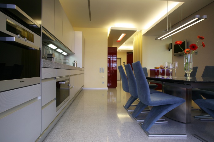 Ультрасовременный московский интерьер создан в результате объединения двух квартир. Его основная идея в использовании ярких архитектурных форм, системы подиумов, нестандартных объемных решений, акцентного света и контрастных материалов. Пространство поделено на функциональные блоки-объемы – разные по назначению жилые зоны. Они выделены с помощью оригинальных перегородок: из матового стекла с динамичной подсветкой, из стекла с изображением панорамы мегаполиса, а также – бионической стены из деревянных панелей.